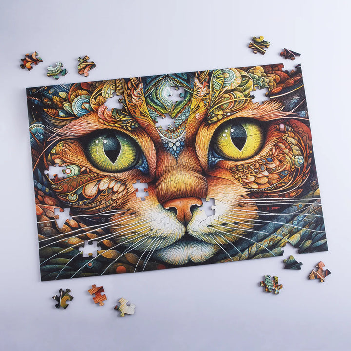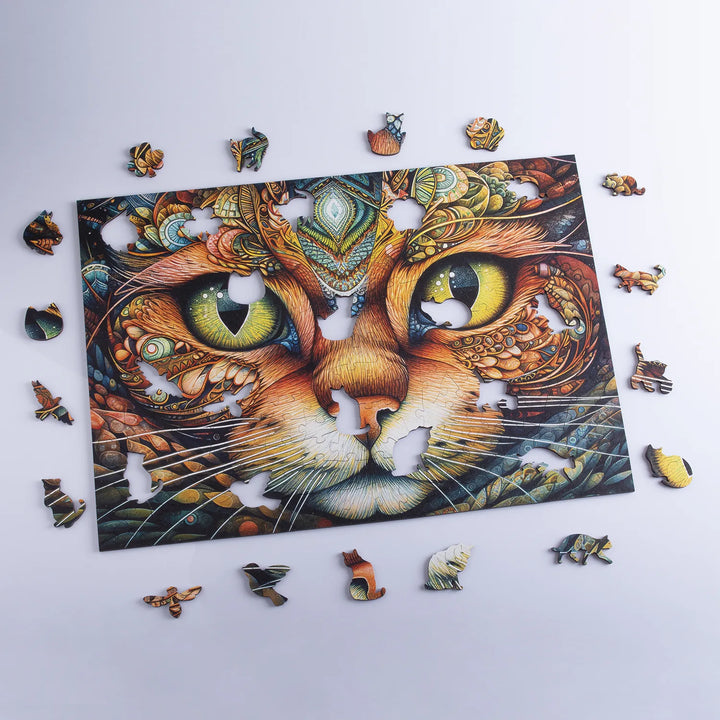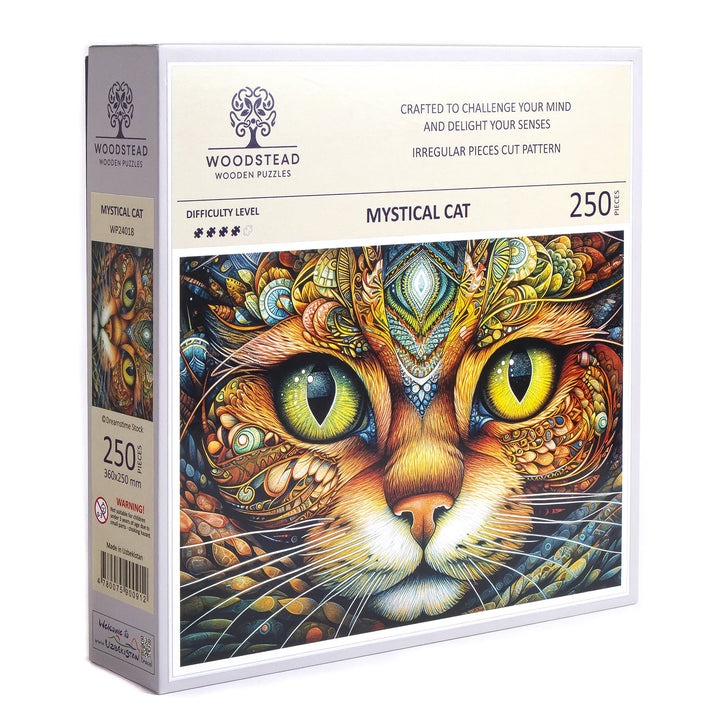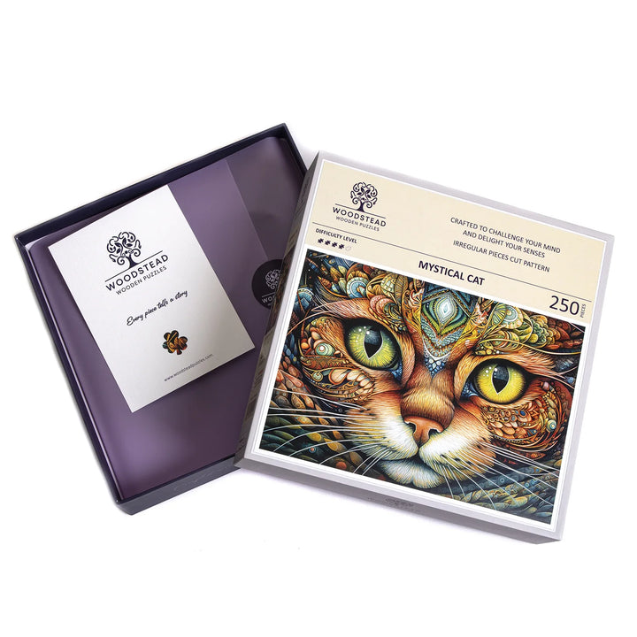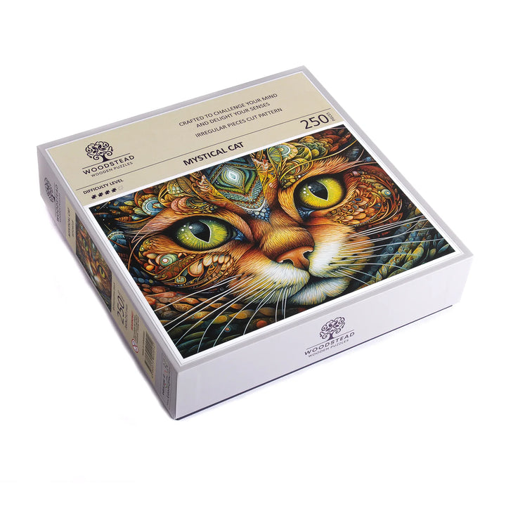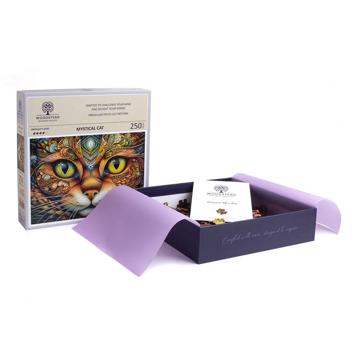 Step into the enchanted world of the Mystical Cat — a wooden jigsaw puzzle that blends celestial charm with feline grace. This striking design features a magical cat adorned with stars, moons, and ornamental details, laser-cut from eco-friendly wood and printed in brilliant, high-resolution color.